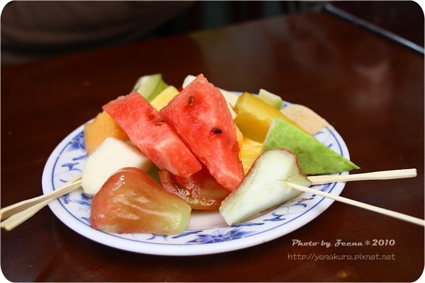 在點了盤綜合水果來吃吃,本來老公想要點薑汁番茄來吃看看的,因為他看上那盤醬料~~