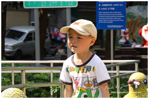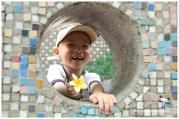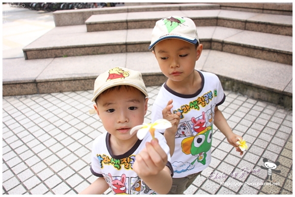 自己笑的很開心~~插了朵花看起來有點"娘"耶~~兒子。