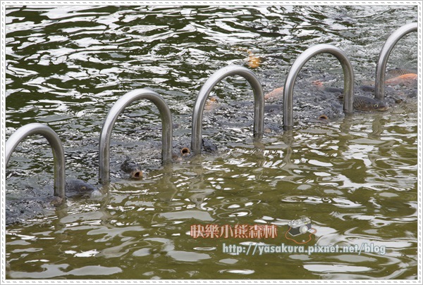 大家都擠在平台邊上,只有少數幾隻會奮力游上平台吃飼料。